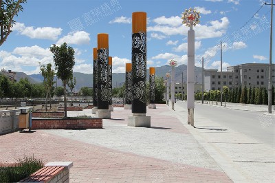 材质:不锈钢景墙、铜灯、铜门、铜树池